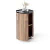 Тумба выполнена из МДФ. В качестве материала отделки используется натуральный шпон американского ореха. Столешница и цоколь покрыты чёрной эмалью.